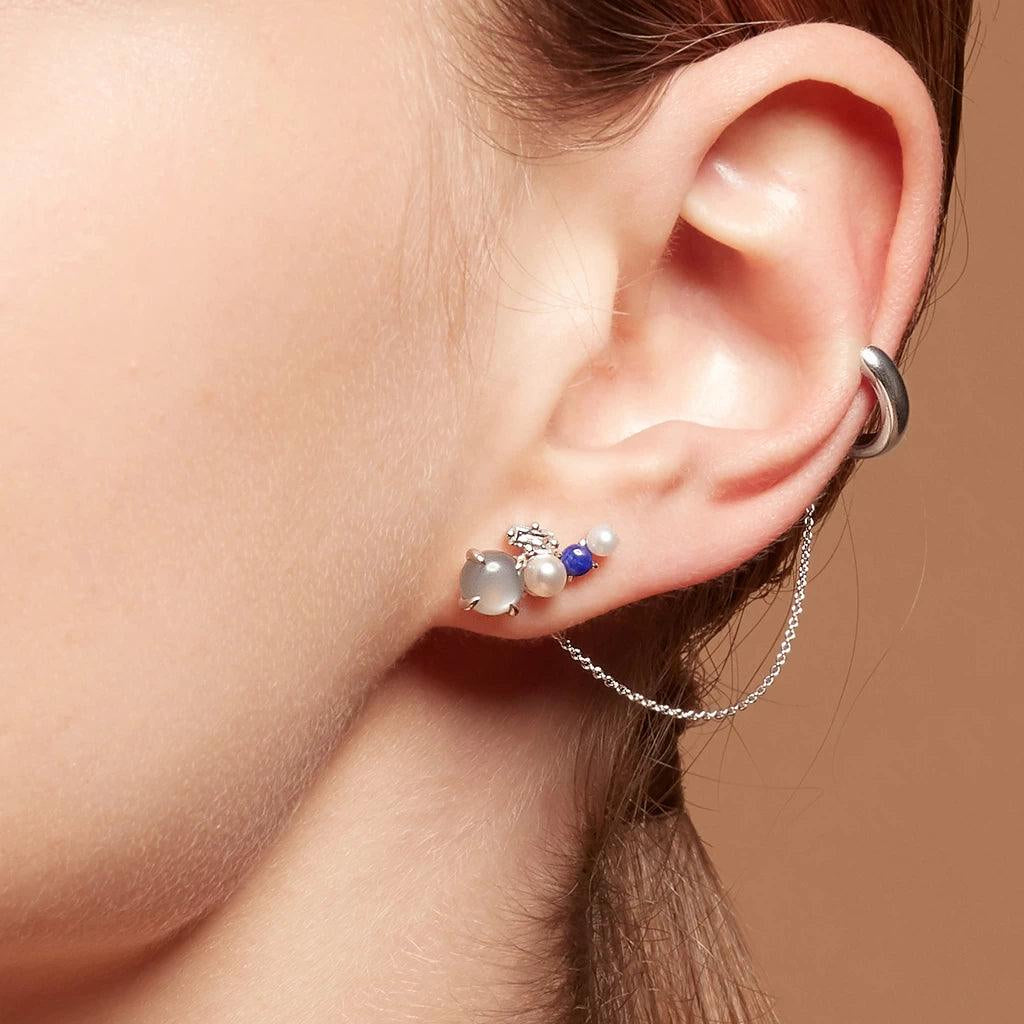 Pair of silver earrings with pearls and blue stones on a light gray backgroundSilver cluster stud earring with pearls and blue stones on ear, modern mixed-stone design.
