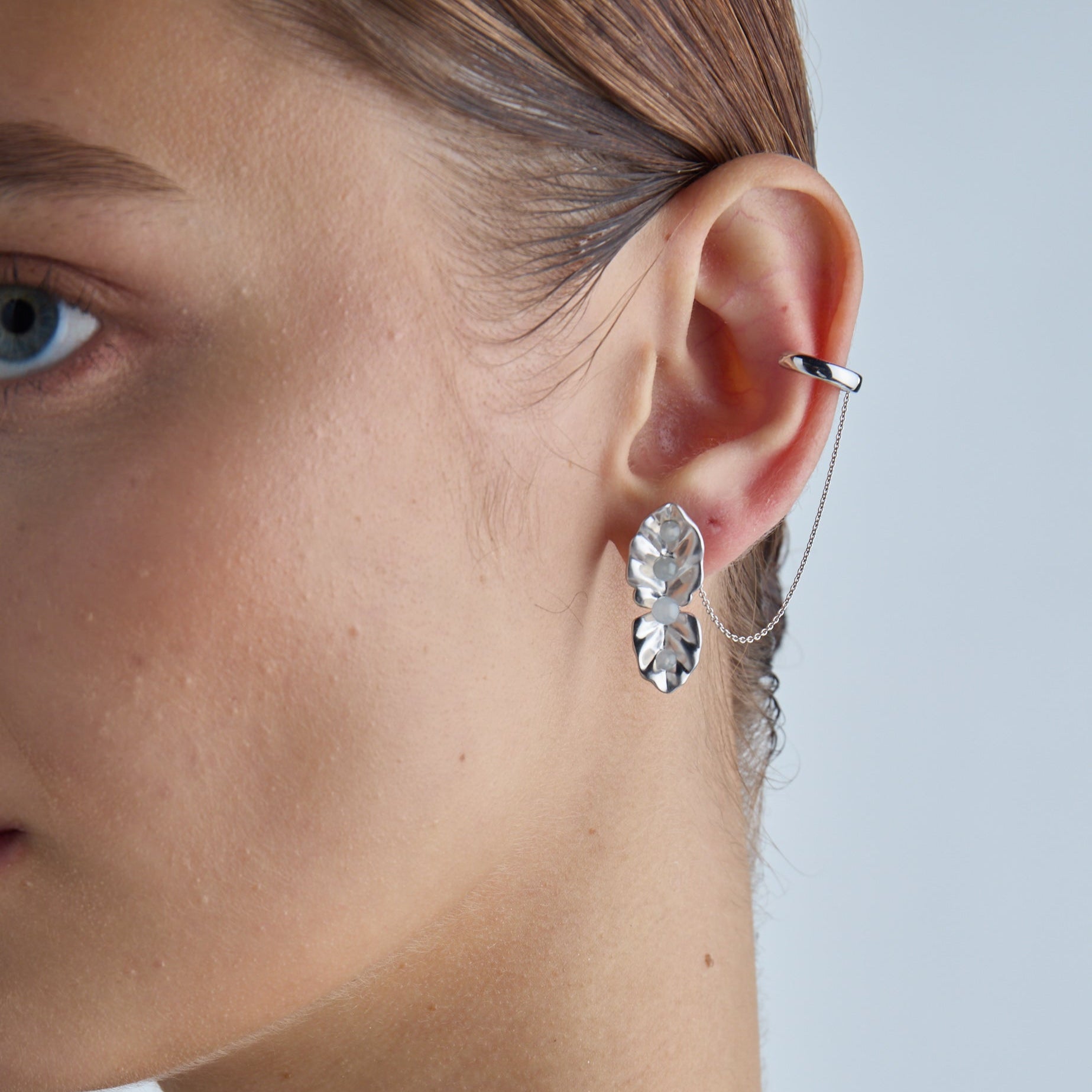 Polished silver-tone ear cuff with minimalist chain designRose gold ear cuff with elegant chain detail and statement gemstone cluster studs