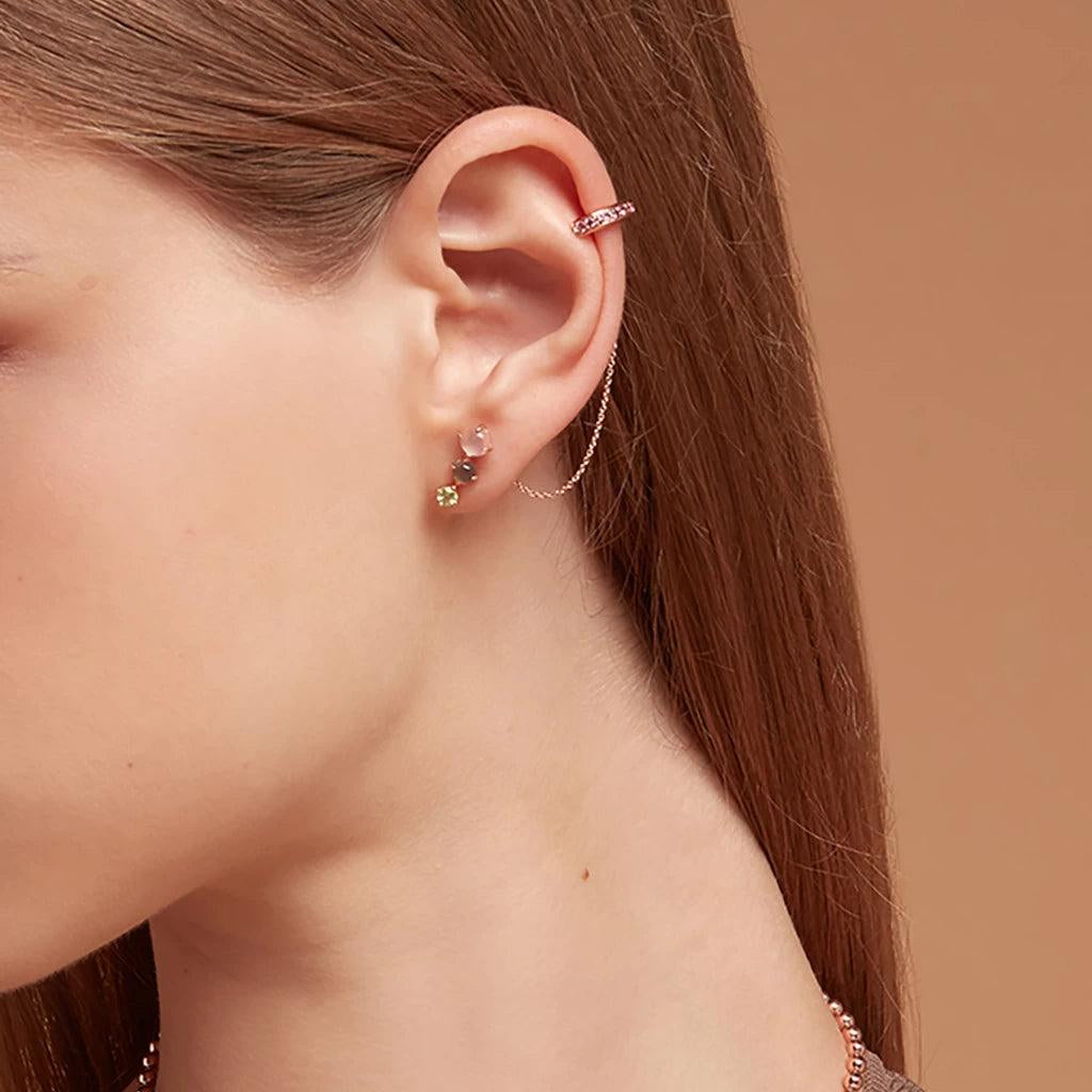 Product image of silver-tone ear cuff with pink gemstones and slim chain laid out on pale background.Rose gold ear cuff with pink stones and chain, paired with multicolor gemstone stud earrings on model