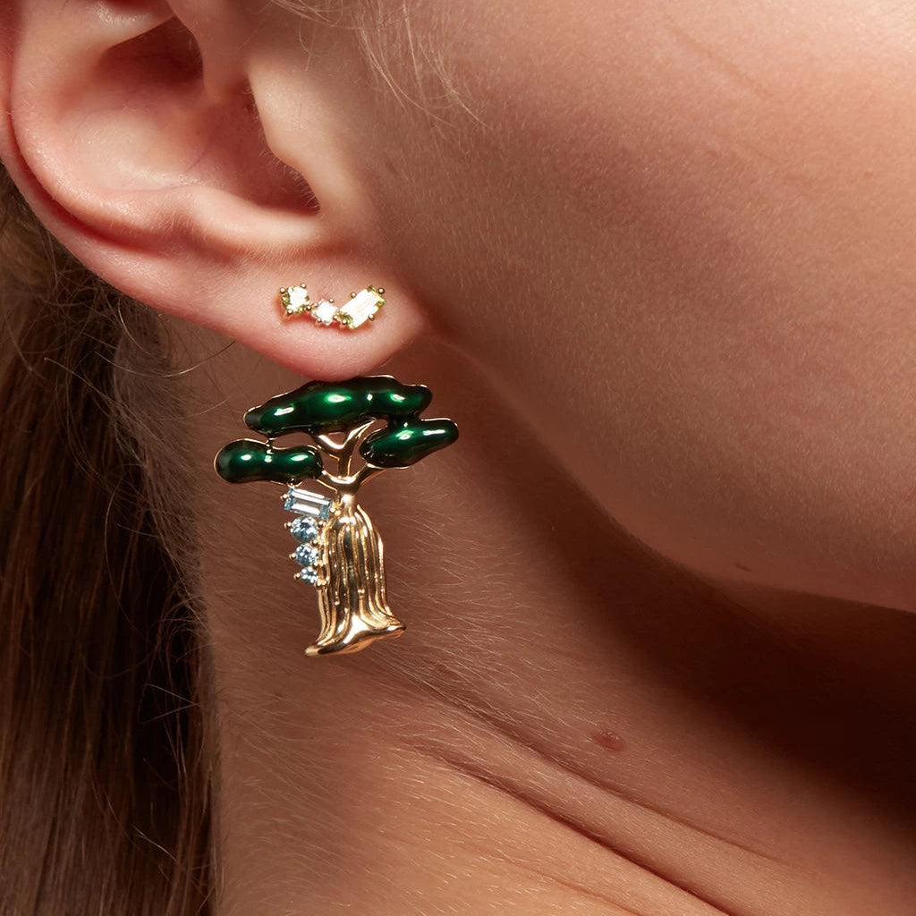 Set with natural Blue Topaz and green enamel accents, selected for their serene energy and harmonious contrast, reflecting both sky and foliage.