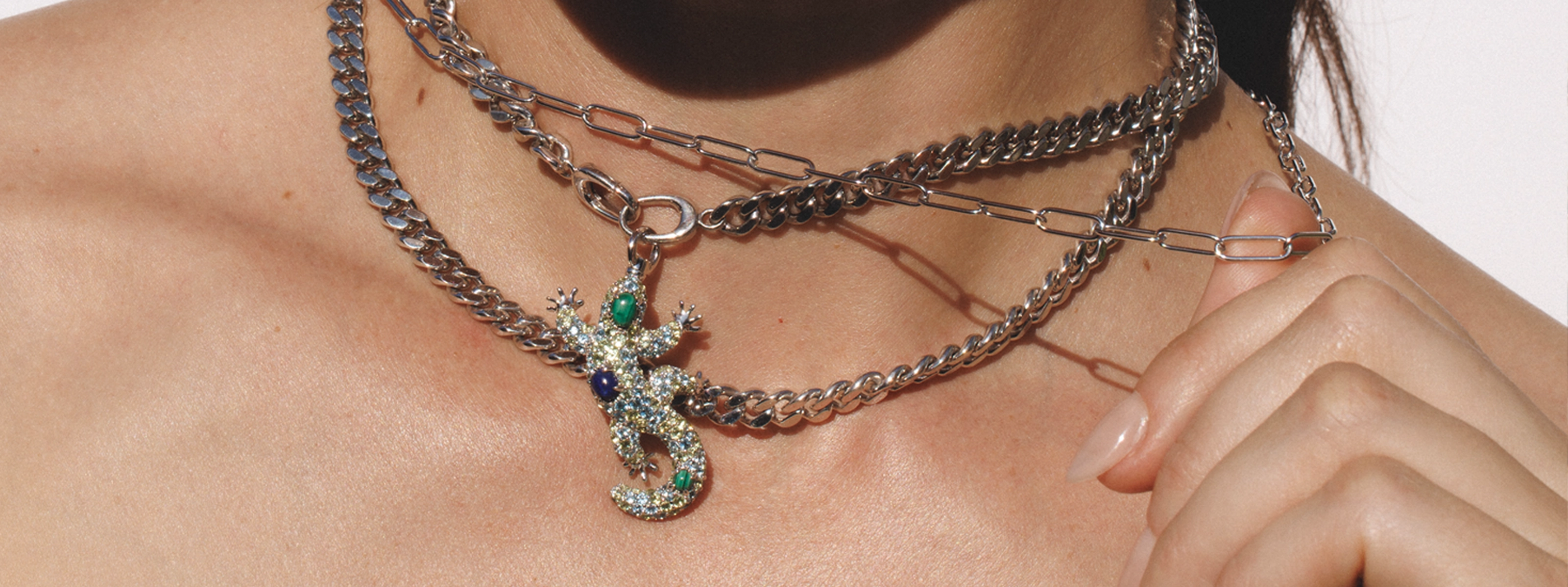 Silver gecko-shaped pendant with gemstones on a light gray backgroundBlonde woman showcasing gold geometric hoop with lizard charm featuring green and blue stones
