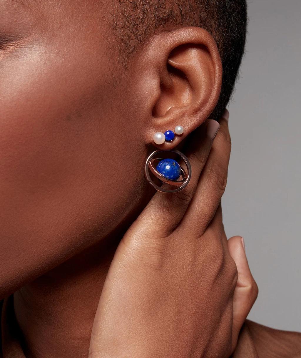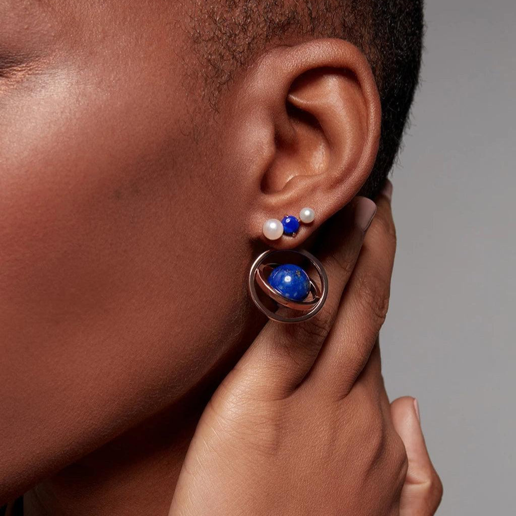 Side profile of woman wearing a bold gold ring with a lapis lazuli gemstone designed in an orbital planet-inspired setting.