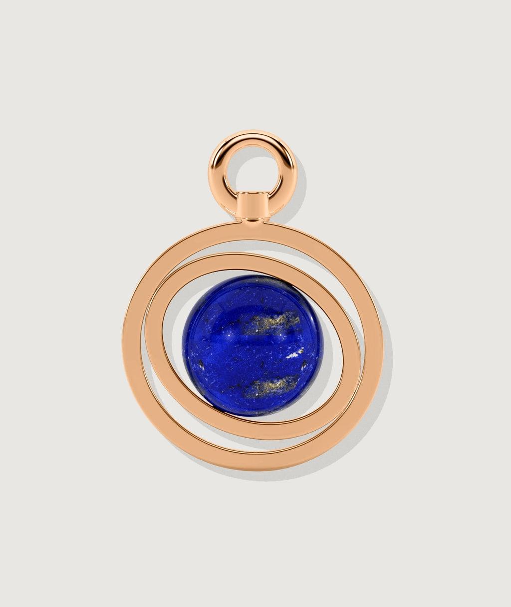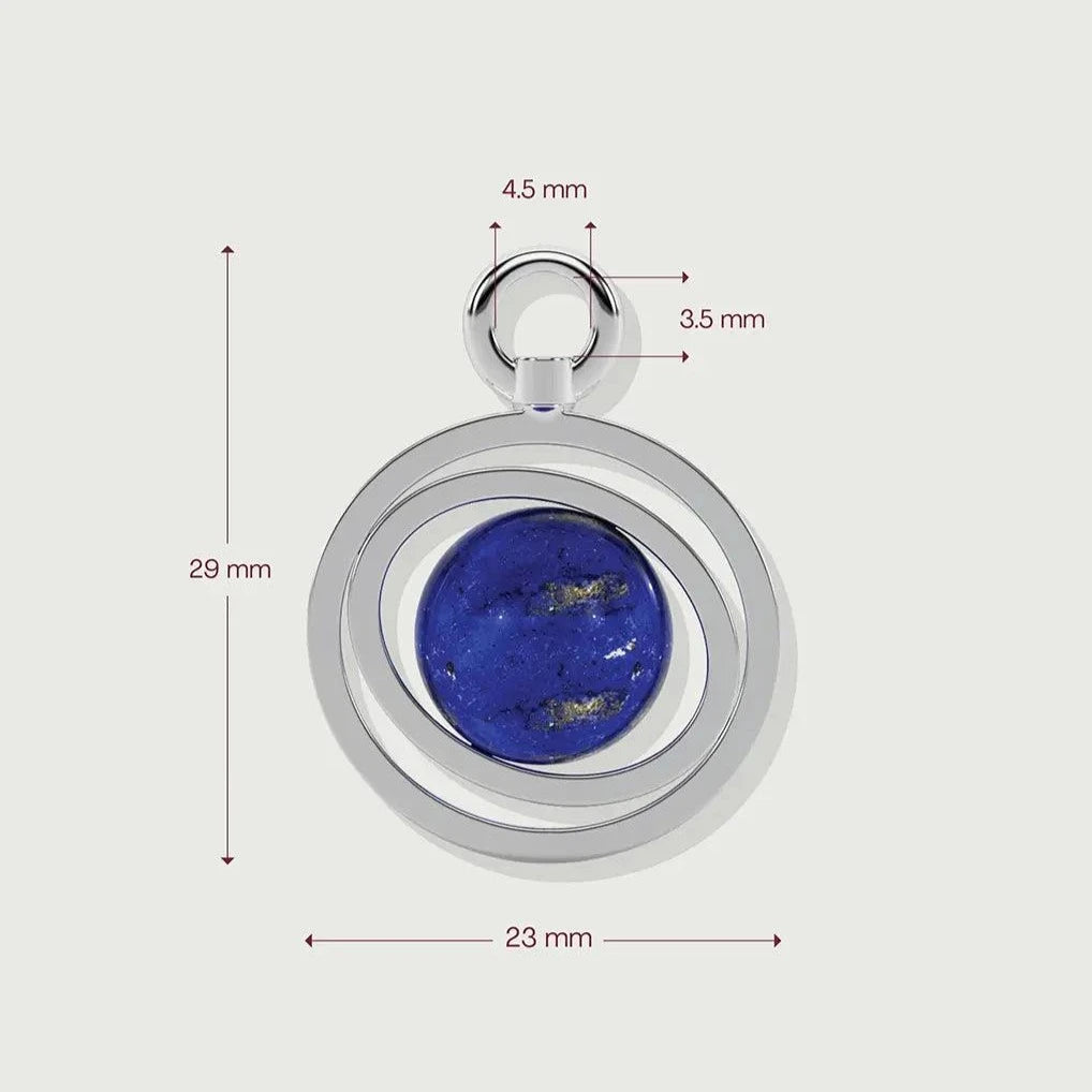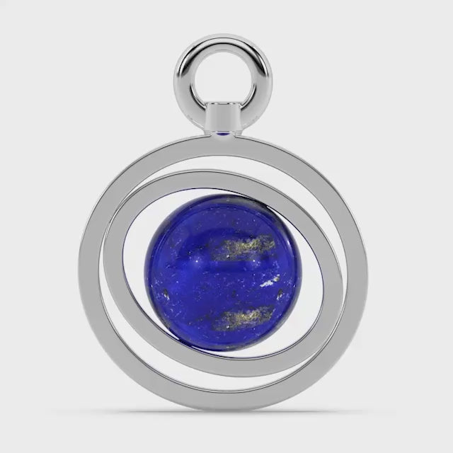 Close-up of a silver orbit-style planetary charm with a lapis lazuli sphere centerpiece resting on a neutral background.