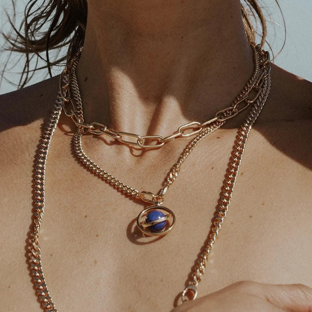 Close-up of a silver orbit-style planetary charm with a lapis lazuli sphere centerpiece resting on a neutral background.Hand holding a gold chain necklace featuring a rotating planetary charm with a blue gemstone centerpiece.