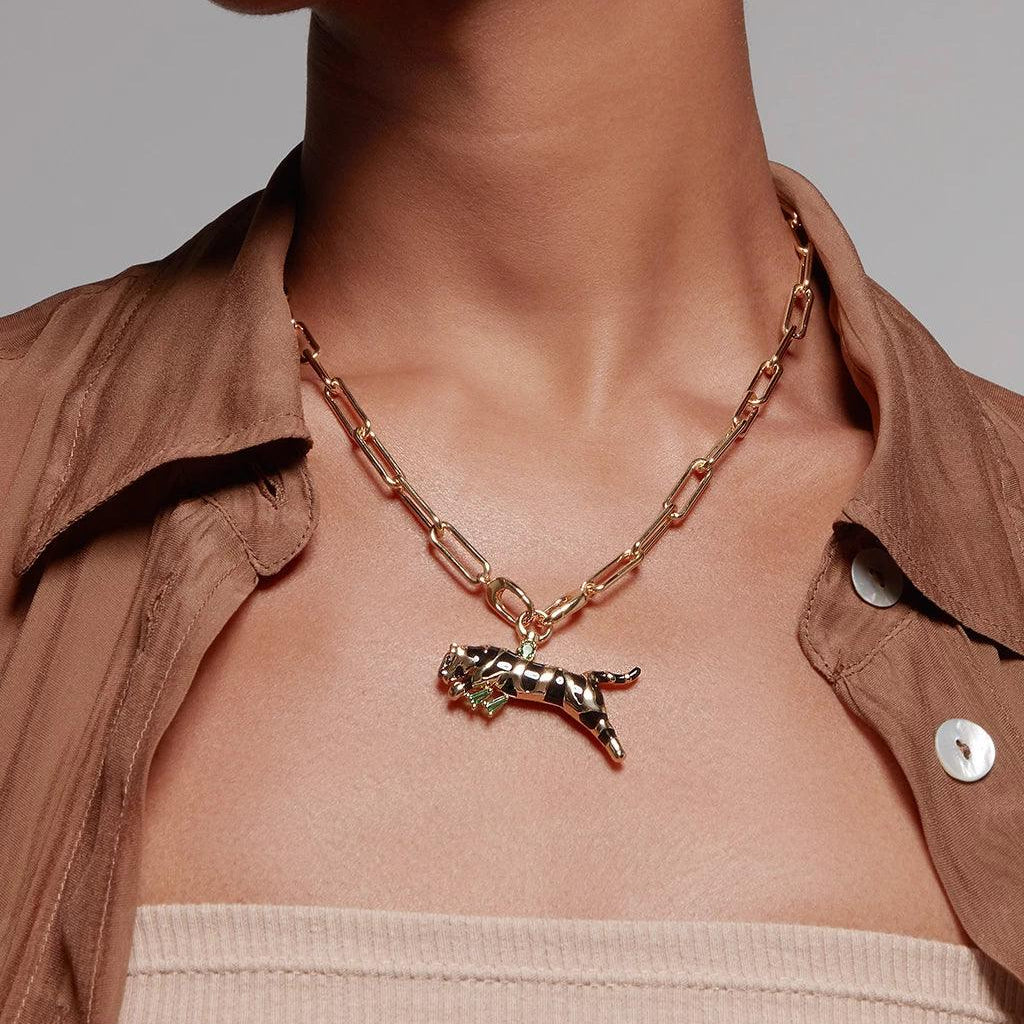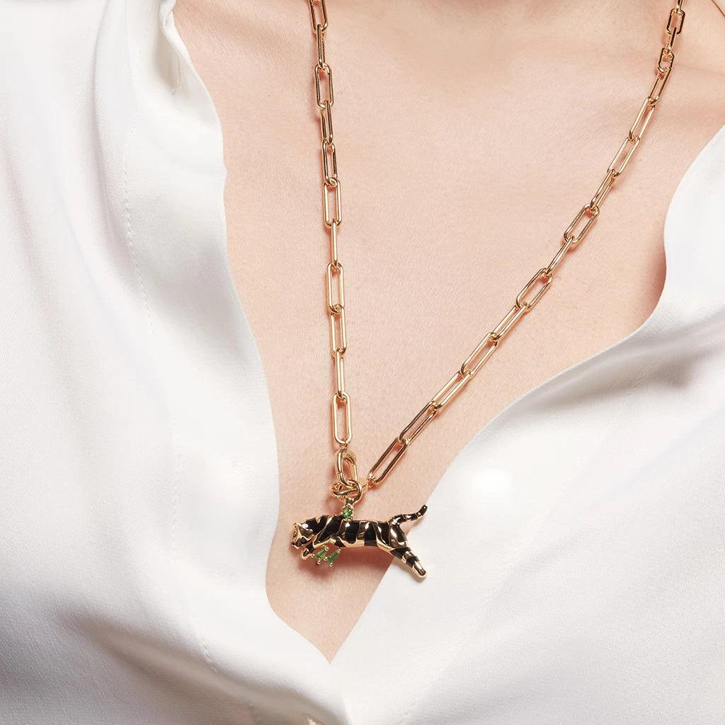 Design inspiration: a fierce yet playful feline form, blending bold black enamel with vibrant green accents to echo the untamed elegance of a tiger.