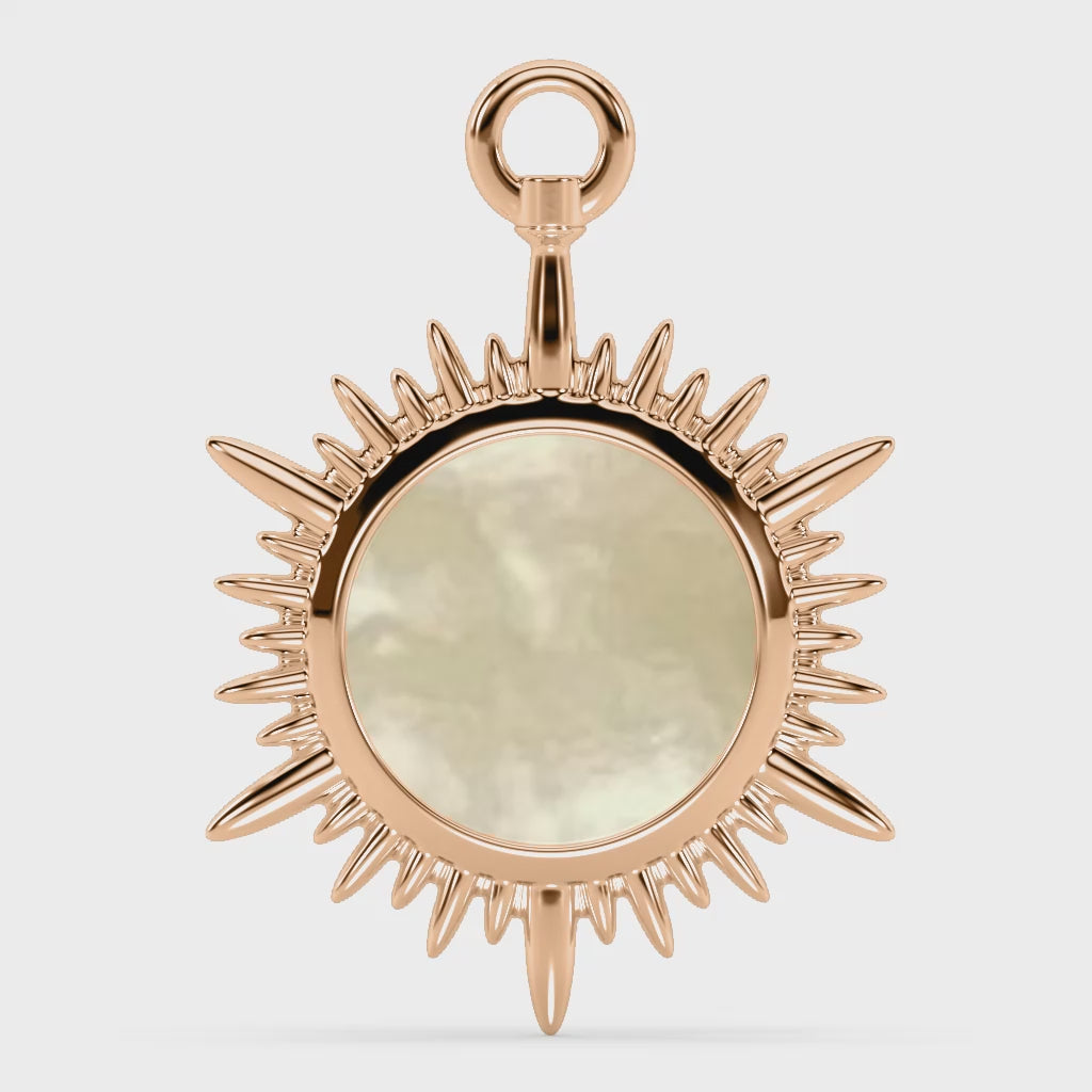 Design inspiration: a radiant sunburst form framed around a luminous Mother‑of‑Pearl center—echoing the first gentle rays of dawn and the promise of new beginnings.