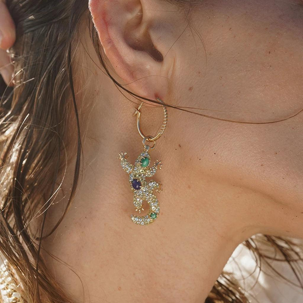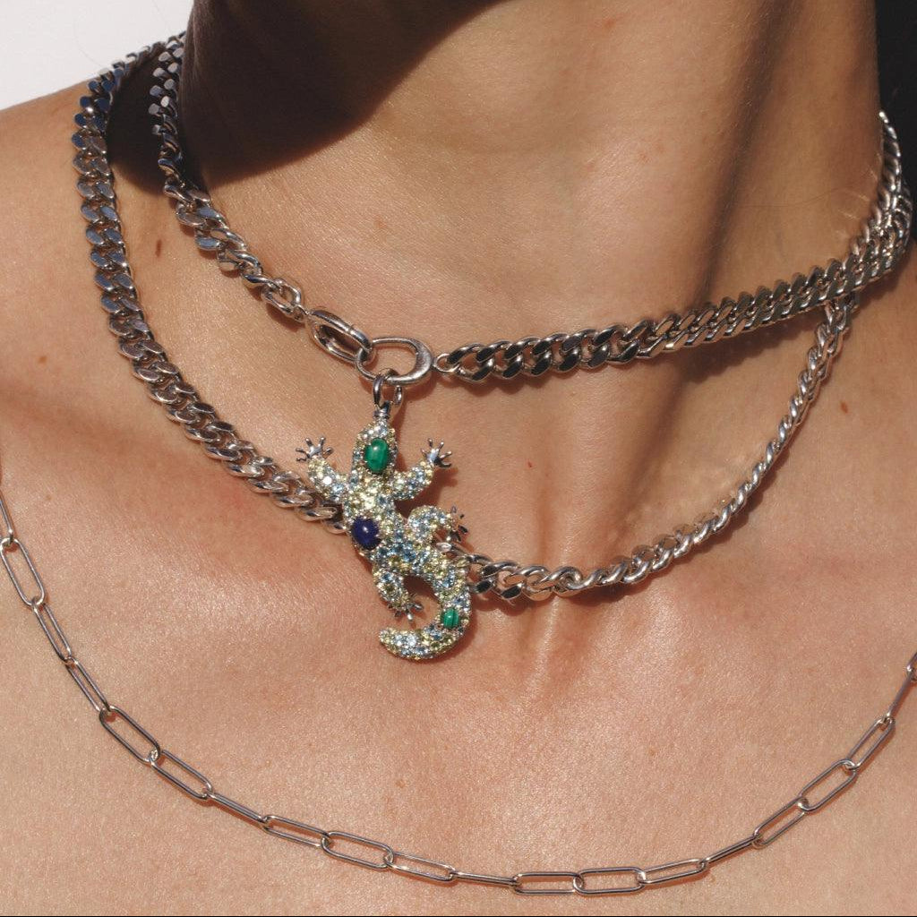 Craftsmanship: detailed gemstone placement mirrors the lizard's unique spot patterns, enhanced by sculptural silverwork and hand-finished textures that catch the light in movement.