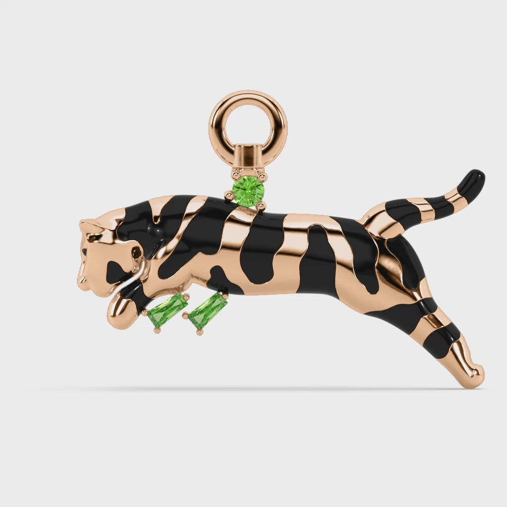 Design inspiration: a fierce yet playful feline form, blending bold black enamel with vibrant green accents to echo the untamed elegance of a tiger.